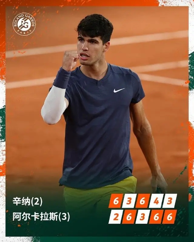 凭借本场胜利,阿尔卡拉斯终结辛纳大满贯12连胜,职业生涯首次闯进法网决赛。
