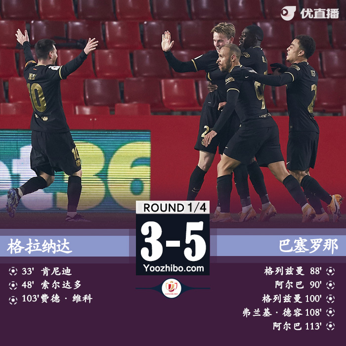 24直播网2月4日讯 北京时间2月4日凌晨4点整,2020-21赛季西班牙国王杯1/4决赛展开角逐,巴塞罗那客场挑战格拉纳达。上半场乌姆蒂蒂失误送礼,肯尼迪首开纪录,下半场索尔达多单刀破门,罗贝托伤退,巴萨三中框,格列兹曼和阿尔巴扳平比分。加时赛格列兹曼、德容和阿尔巴先后破门,最终巴塞罗那客场5-3战胜格拉纳达,巴萨晋级国王杯四强。