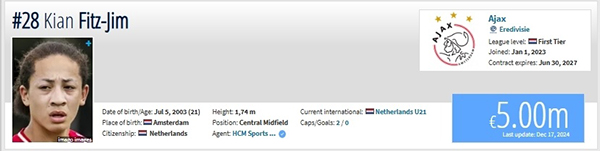 相较于上期更新,他本次又涨了200万欧。而短短半年内的2次身价更新,菲慈佔-天乐的身价从100万欧暴涨5倍,可见他的成长速度之快。