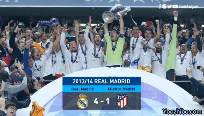 北京时间2014年5月25日02:45,2013/14赛季欧冠决赛在葡萄牙里斯本的光明球场举行,来自西甲的两支球队皇家马德里和马德里竞技将角逐冠军。上半场迭戈-科斯塔旧伤复发早早被换下,贝尔错失绝佳机会之后,戈丁抓住卡西失误打破僵局,上半场马竞1-0领先;下半场皇马强势反扑,C罗、贝尔接连错失机会,拉莫斯第93分钟扳平,两队90分钟战成1-1,进入加时赛。第109分钟,贝尔头球破门反超比分,117分钟马塞洛破门,帮助皇马夺第10座欧冠冠军。