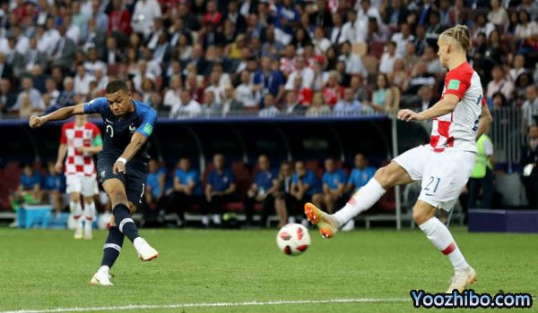 博格巴中场长传,马图伊迪左路传中,姆巴佩中路争顶,吉鲁倒勾到右侧,布罗佐维奇抢在格列兹曼前面铲球解围险些自摆乌龙,球稍稍偏出右门角。法国第65分钟又下一城!埃尔南德斯左路突破低传,姆巴佩在门前24米处大力低射钻进左下角,4比1。他成为仅次于贝利的世界杯决赛第2年轻进球球员,也是继1986年布鲁查加(南特)之后,第2位世界杯决赛进球的法甲球员。他在本届杯赛打进4球,在U20球员中仅次于1958年的贝利(6球)。法国队成为1966年以来首支决赛中两次禁区外破门的球队。
