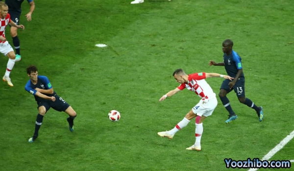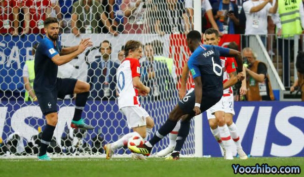 摩德里奇右侧任意球传中,帕瓦尔头球解围,洛夫伦左侧距门9米处射门打在博格巴背部偏出近门柱。乌姆蒂蒂左膝受伤,到场边接受治疗。整个上半时法国只有1次射门(1比7),比分却2比1领先。过去世界杯决赛上半时落后的球队,只有1930年乌拉圭逆转夺冠。