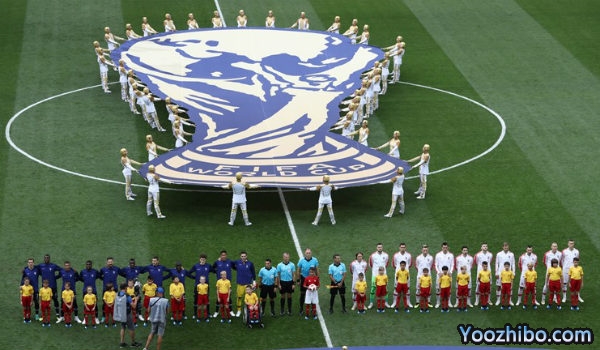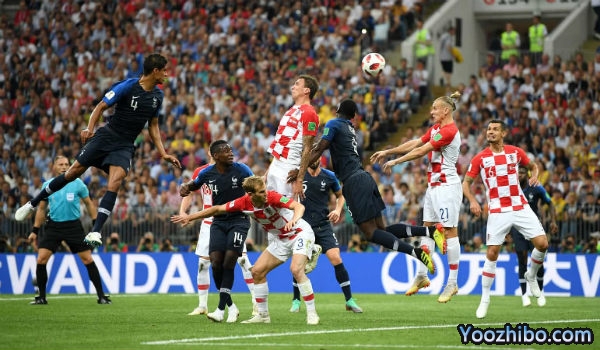 两国总统马克龙和基塔诺维奇到场观战。赛前举行简短闭幕式,上届冠军队长拉姆与超模沃迪亚诺娃护送大力神杯入场。开场后两队都非常谨慎,双方还没射门就已经出现进球!第18分钟,格列兹曼拿球造成布罗佐维奇犯规,他在门前27米处亲自主罚任意球传入禁区,曼朱基奇小禁区前沿头球解围蹭进本方球门左上角,1比0。此前10届决赛,先进球的球队夺得9个冠军,唯一例外正是法国(2006年点球负意大利)。