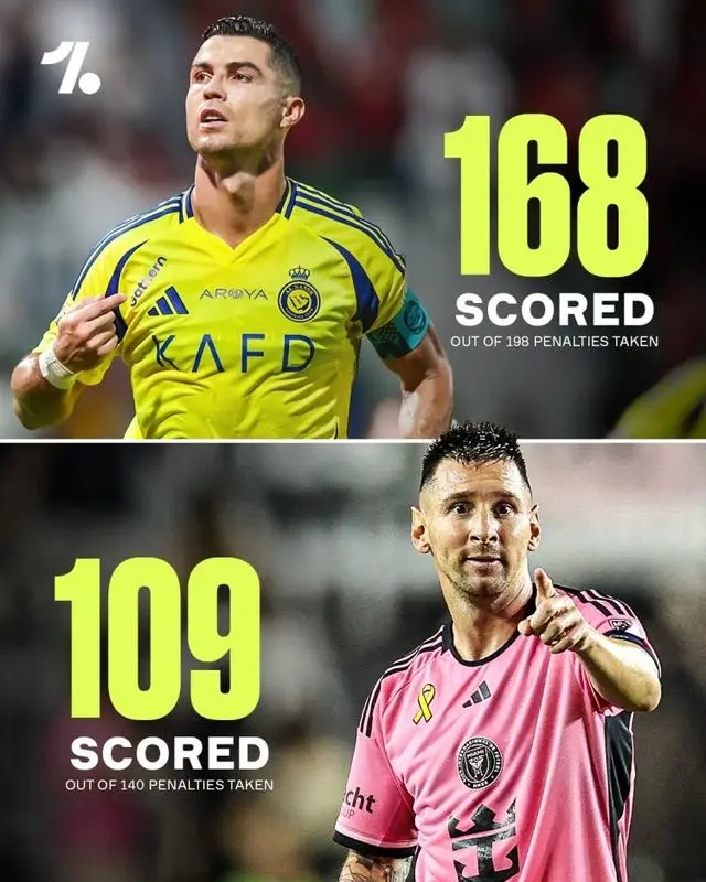 梅罗罚点数据大对比,C罗点球成功率更高