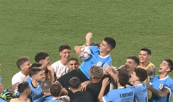 赛后,乌拉圭队友们将苏亚雷斯和他的谢幕战用球,抛向空中致敬,而苏亚雷斯则开心咧嘴大笑。