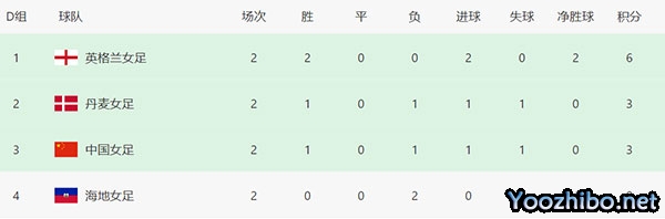 D组的中国女足在首战输球的情况下,以1-0击败海地队,积分虽然追平了本轮被英格兰击败的丹麦队,但晋级形势依旧不容乐观。首先中国女足最后一场的对手是英格兰队,中国队要力争赢球才有机会晋级,丢分的话主动权不在自己的手中。英格兰队的实力比中国队强,取得两连胜,中国女足想要隔空力压丹麦或者反超英格兰队的话,真的要全力以赴了。