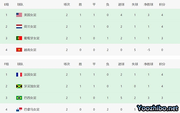 E组的美国队和荷兰队都是1胜1平的状态,葡萄牙队虽然击败越南女足,但接下来她们对阵世界排名第一的美国队,晋级希望并不大,越南队出局。F组的法国队和牙买加队4分领跑,占据晋级的主动权,3分的巴西队接下来要力争击败牙买加女足了。