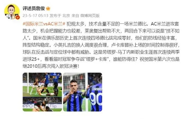 来源:24直播网05-17 16:2524直播网04月17日讯 3:00,欧冠半决赛次回合米兰德比,国米1-0战胜米兰,总比分3-0晋级决赛。赛后著名足球评述员詹俊发文评价了本场比赛:犯规太多,技术含量不足的一场米兰德比。