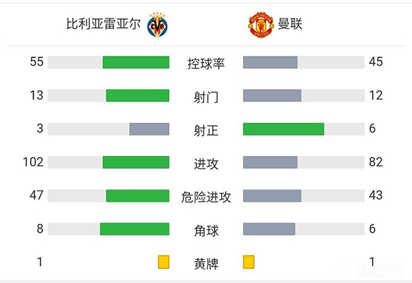 全场比赛结束,曼联客场2-0战胜比利亚雷亚尔。