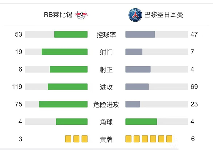全场比赛结束,RB莱比锡2-2巴黎圣日耳曼。