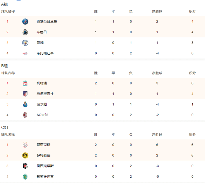 来源:24直播网09-30 11:2024直播网9月30日讯 ,欧冠小组赛第二轮全部完赛,各大豪门状态不一,A组的巴黎圣日耳曼2-0完胜曼城、布鲁日2-1击败莱比锡;B组的利物浦5-1大胜波尔图、马竞2-1击败AC米兰;C组的阿贾克斯2-0击败贝西克塔斯、多特蒙德1-0击败葡萄牙体育;D组的蒂拉斯波尔警长2-1击败了皇马、国米0-0踢平顿涅茨克矿工;E组的拜仁5-0大胜基辅迪纳摩、巴萨0-3输给本菲卡。