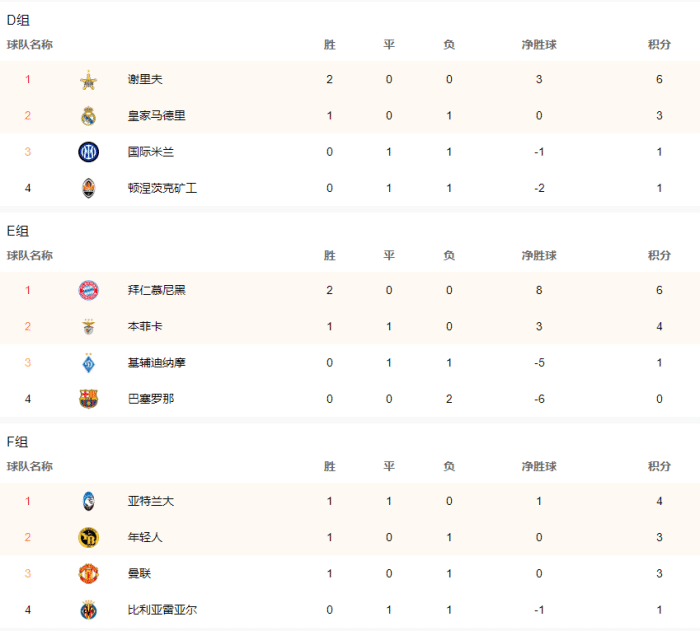 F组的亚特兰大1-0伯尔尼年轻人、曼联2-1比利亚雷亚尔;G组的萨尔茨堡红牛2-1击败里尔、沃尔夫斯堡1-1塞维利亚;H组的尤文图斯1-0击败切尔西、泽尼特4-0击败马尔默。本轮过后,欧冠最新积分形势出炉,前两轮表现最糟糕的豪门球队是欧冠7冠王AC米兰和欧冠5冠王巴塞罗那,AC米兰先后2-3输给利物浦、1-2输给马竞,排名B组倒数第一名,不过球队依然看到了复苏的迹象,惜败给利物浦和马竞都是能接受的结果。