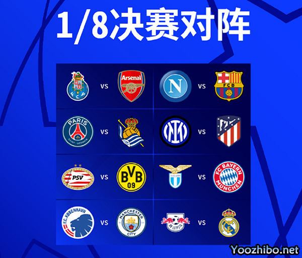 波尔图vs阿森纳、那不勒斯vs巴塞罗那、巴黎vs皇家社会、国米vs马竞、埃因霍温vs多特、拉齐奥vs拜仁、哥本哈根vs曼城、莱比锡vs皇马