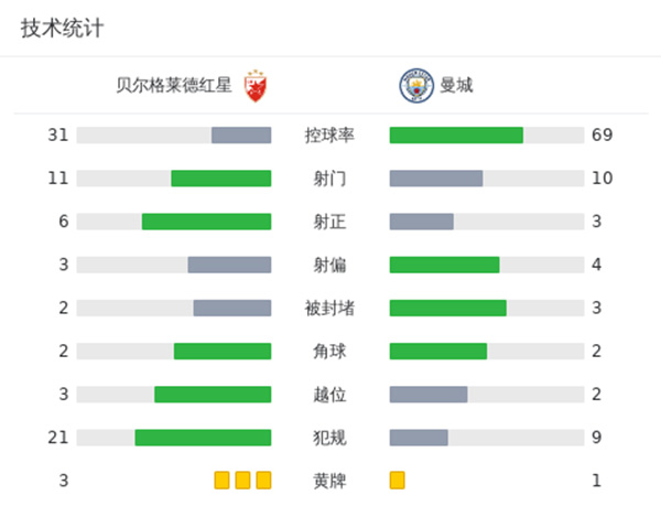 第19分钟,努内斯中路斜传汉密尔顿右路禁区拿球后晃开防守球员小角度爆射破门,贝尔格莱德红星0-1曼城。