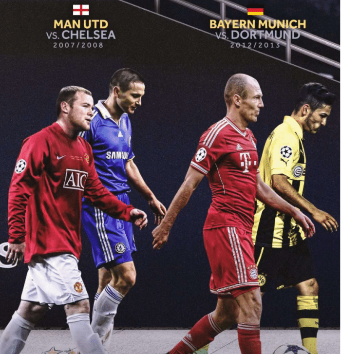 第三次欧洲决赛联赛内战就是07-08赛季欧冠了,那个赛季,利物浦、曼联和切尔西在四强赛围剿巴萨,最终切尔西淘汰了利物浦,曼联淘汰了巴萨,而在决赛赛场上,双方1比1战平,而随后的点球大战中,曼联6比5战胜切尔西夺冠。随后是12-13赛季欧冠拜仁、多特、皇马和巴萨进入四强,最终拜仁淘汰了巴萨,多特淘汰了皇马,而在欧冠决赛赛场上拜仁2比1战胜多特夺冠。不过,不少多特球迷都对此感到不满,因为拜仁在赛前宣布格策加盟球队,极大的影响了多特的士气。