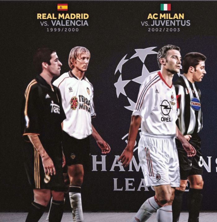 欧冠决赛第一次出现同联赛内战是在99-00赛季,那个赛季皇马、巴萨、瓦伦西亚和拜仁进入四强,而最终皇马淘汰了拜仁,瓦伦西亚淘汰了巴萨,而在决赛赛场上,皇马凭借莫伦特斯、麦克马纳曼和劳尔的进球,3比0战胜瓦伦西亚,拿到了欧冠冠军。而第二次欧冠决赛出现内战是在02-03赛季,那个赛季皇马、尤文、米兰和国米进入四强,又是三支同联赛的球队围剿一支球队,最终尤文淘汰了皇马,米兰淘汰了国米,而在决赛赛场上,双方达成0比0,随后进入点球大战,这场比赛是布冯最接近拿到欧冠冠军的比赛,他接连扑出了西多夫和卡拉泽的点球,不过迪达这场比赛更出色,他连续扑出三个点球,最终帮助米兰夺冠。