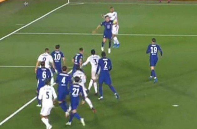 这一幕发生在比赛第29分钟,皇马通过任意球最终由本泽马凌空抽射攻破了切尔西门将门迪的十指关。不过慢镜头显示,在莫德里奇将球传至切尔西禁区时,皇马球员卡塞米罗在与切尔西队长阿兹皮利奎塔争顶时,有明显的压人犯规。
