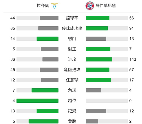 下半场伤停补时4分钟,随后全场比赛结束,拜仁4-1击败拉齐奥占得先机。