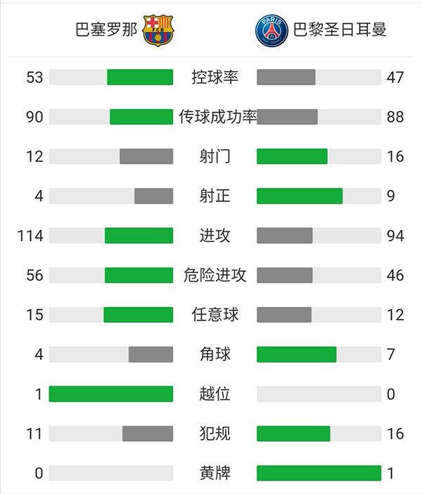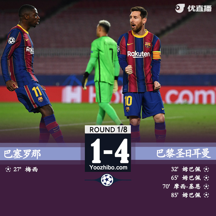 全场比赛结束,巴塞罗那主场1-4不敌巴黎圣日耳曼。