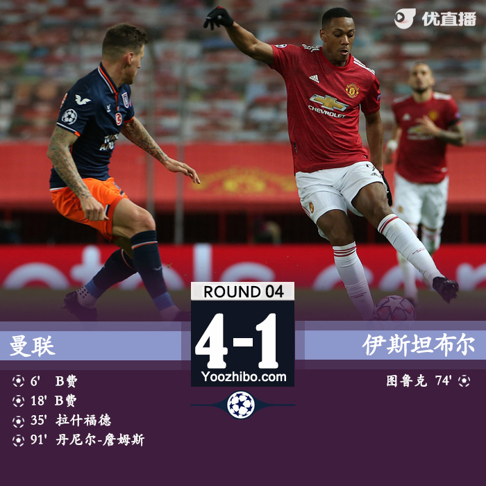欧冠简报:曼联4-1伊斯坦布尔 B费双响拉什福德点射