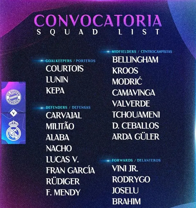 24直播网讯 北京时间4月28日,皇马公布欧冠客战拜仁大名单,贝林厄姆领衔 巴尔韦德、维尼修斯在列。
