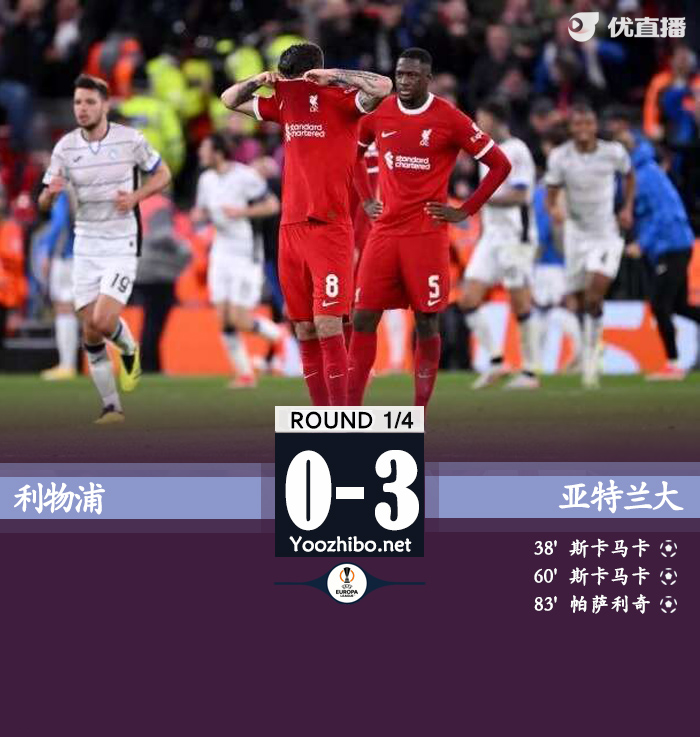 24直播网讯:北京时间4月12日欧联 1/4决赛首回合,利物浦主场对阵亚特兰大。开场凯莱赫神级扑救,努涅斯丢单刀,埃利奥特中框,斯卡马卡禁区推射破门,下半场斯卡马卡梅开二度,萨拉赫破门被吹,帕萨利奇锁定胜局。最终比分利物浦 0-3 惨败亚特兰大。