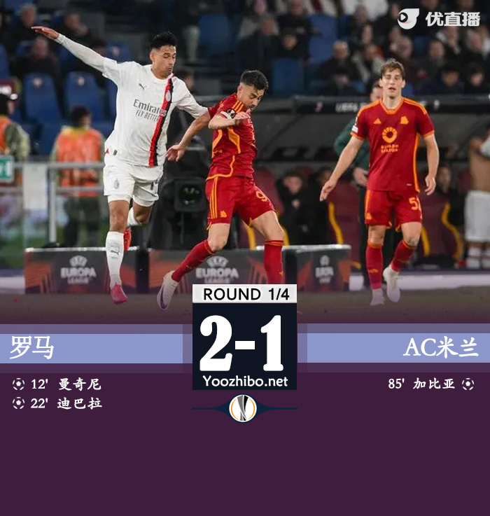 24直播网讯:北京时间4月19日欧足联欧洲联赛 1/4决赛次回合,罗马主场对阵AC米兰。上半场,佩莱格里尼远射中柱后曼奇尼机敏补射破门,奇克凌空扫射击中横梁,迪巴拉兜射入网扩大比分,卢卡库有些受伤被换下场,切利克铲球蹬到莱奥脚后跟被直红罚下;下半场,斯皮纳佐拉推射被挡,赖因德斯远射被托出横梁,莱奥助攻加比亚头球破门扳回一个,丘库埃泽内切兜射被扑。最终比分罗马2-1AC米兰。两回合总比分罗马3-1AC米兰。