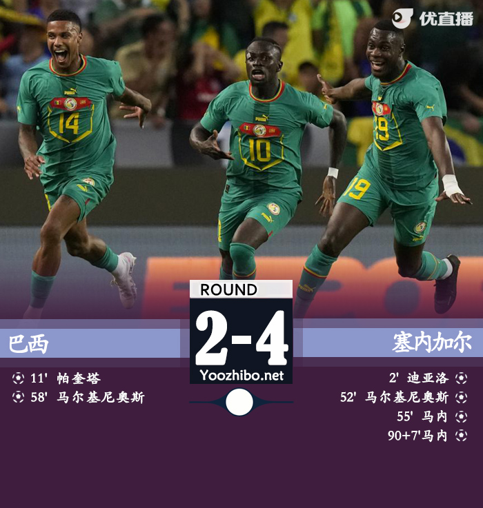 24直播网讯 北京时间6月21日03:00,国际足球友谊赛巴西迎战塞内加尔的比赛,上半场帕奎塔头球破门,迪亚洛凌空抽射扳平,下半场马尔基尼奥斯建功+乌龙,马内双响,最终巴西2-4塞内加尔。