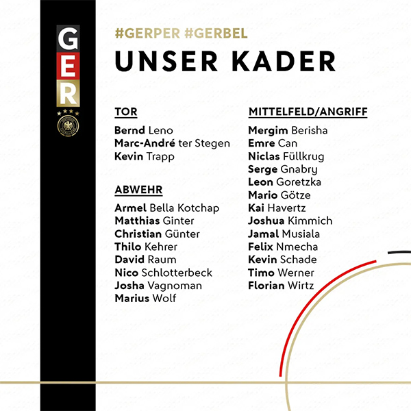 中前场:贝里沙(奥格斯堡)、埃姆雷-詹(多特蒙德)、菲尔克鲁格(不莱梅)、格纳布里(拜仁慕尼黑)、格雷茨卡(拜仁慕尼黑)、格策(法兰克福)、哈弗茨(切尔西)、基米希(拜仁慕尼黑)、穆西亚拉(拜仁慕尼黑)、恩梅查(沃尔夫斯堡)、沙德(布伦特福德)、维尔纳(莱比锡)、维尔茨(勒沃库森)