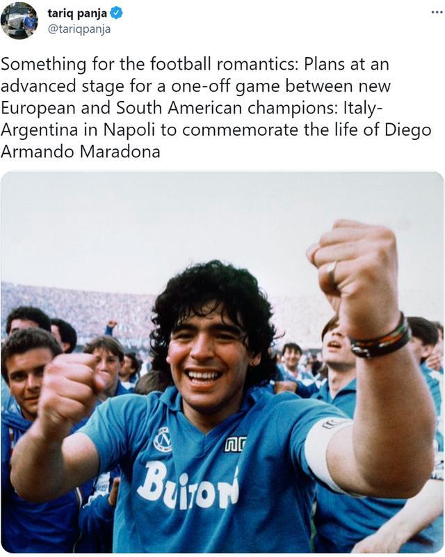 这正是两大洲足联合作的一次契机,马拉多纳是阿根廷和那不勒斯名宿,恰好意大利与阿根廷今夏都拿到了冠军,因此两队计划在今年12月或明年1月踢一场友谊赛,纪念马拉多纳。
