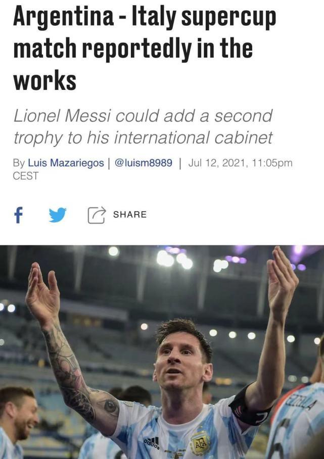 据悉,首届欧美杯时间将会在2022年,初步确定会在卡塔尔世界杯前举办。而首届欧美杯参赛球队,自然将会是刚刚分别夺得欧洲杯和美洲杯冠军的意大利和阿根廷队。对此,阿根廷媒体也十分期待的写道:“梅西有望很快夺得自己在国家队的第二座洲际大赛的冠军了!”