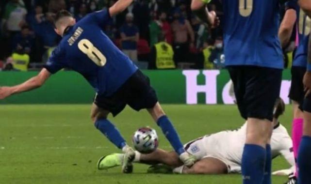 加时赛第112分钟,英格兰进攻被破坏,随后英格兰球员格拉利什和意大利中场若日尼奥都去抢球。格拉利什用一个滑铲,先碰到了球,而若日尼奥没有收腿,他的脚先是踩在了球上。但因为皮球太滑,若日尼奥的鞋钉随后直接重重的踩在了格拉利什的膝盖上。