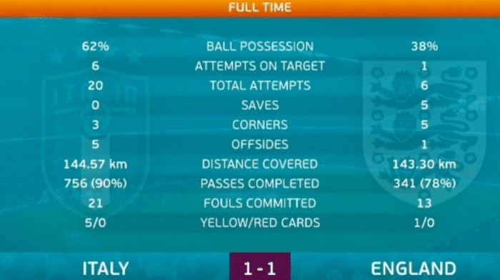 24直播网讯 今天凌晨,意大利在欧洲杯决赛中点球击败英格兰,夺得队史第二座欧洲杯冠军,以下为两队本场比赛的数据对比。