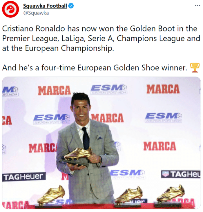 这位葡萄牙巨星职业生涯至今已经获得过英超、西甲、意甲、欧冠和欧洲杯五项不同赛事的金靴,不仅如此,他还4度被评为欧洲最佳射手。