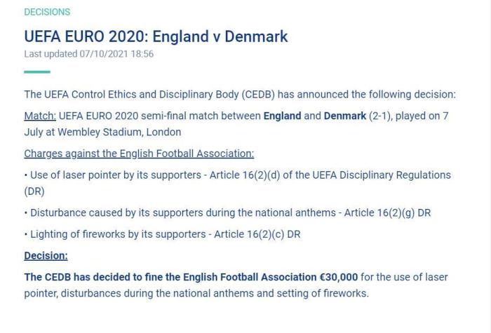 欧足联纪律与道德委员会决定,对英足总罚款3万欧元。