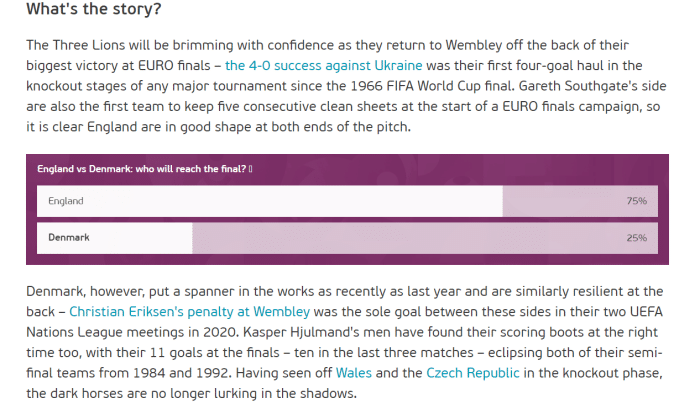 来源:24直播网07-07 19:3224直播网讯 意大利已经战胜了西班牙晋级欧洲杯决赛,而明天凌晨英格兰和丹麦将会争夺最后一个欧洲杯决赛的席位,那么两支球队到底谁能获胜呢?近日,欧足联照例发布了两队比赛的前瞻,同时欧足联发布了问卷调查,让球迷选择谁能获胜,而75%的球迷都认为英格兰获胜,只有25%的球迷认为丹麦会获胜,话不多说,一起看看欧足联的前瞻吧!