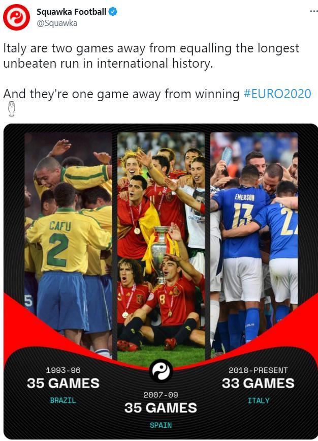 意大利连续33场不败,距追平世界纪录只差2场
