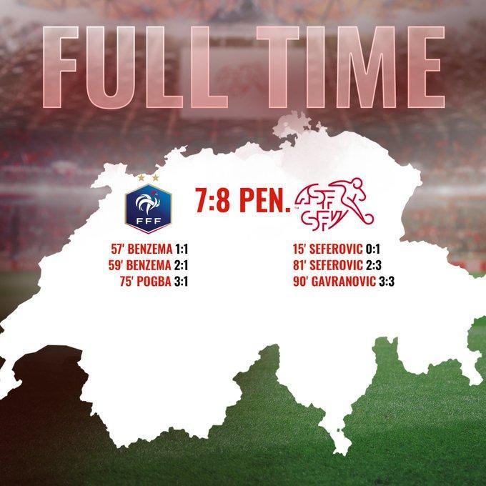 来源:24直播网06-30 20:0024直播网讯 几天前,法国在欧洲杯1/8决赛中遭遇瑞士,上半场塞费罗维奇先拔头筹,下半场洛里扑点,本泽马梅开二度反超比分,博格巴世界波,塞费罗维奇头球梅开二度,加夫拉诺维奇绝平。比赛被拖入加时赛,双方均无建树,点球大战姆巴佩失点,法国总比分7-8爆冷遭到淘汰。