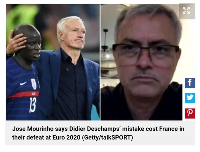 来源:24直播网06-30 10:4424直播网讯 今天凌晨结束的欧洲杯1/8决赛中,法国队爆冷失利。赛后,穆里尼奥在接受TalkSport采访时谈到了德尚87分钟换下格列兹曼的举措,穆帅表示这次换人是德尚犯下的一个错误。