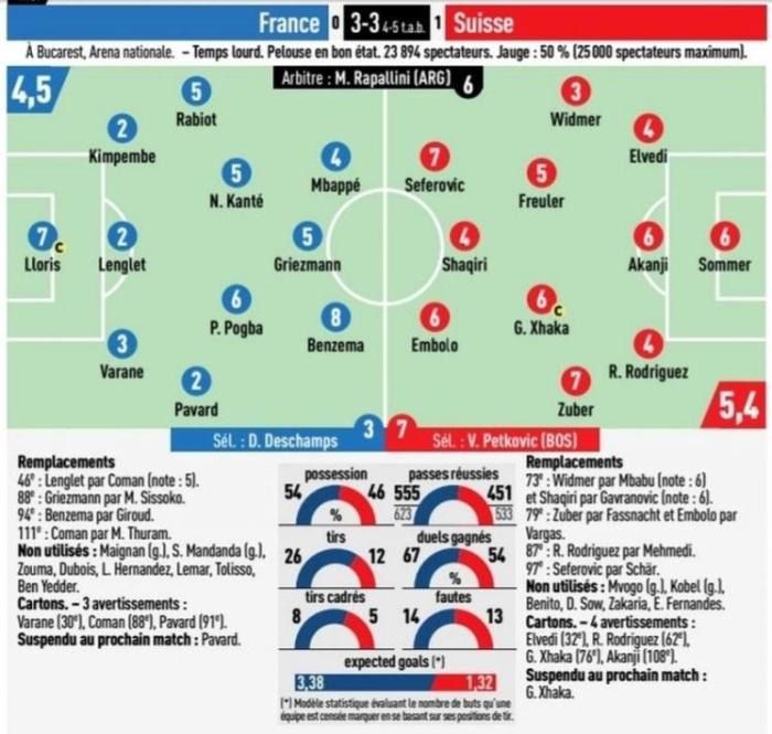 24直播网讯 在昨晚欧洲杯1/8决赛,法国队点球大战不敌瑞士,遭爆冷淘汰。赛后,法国《队报》对两队球员的表现进行了评分。