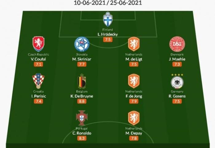 24直播网讯 昨晚,随着E组与F组比赛的结束,欧洲杯小组赛阶段的比赛已经全部结束,WhoScored评出了小组赛阶段的最佳阵容,C罗领衔,德布劳内在列,德佩入选。
