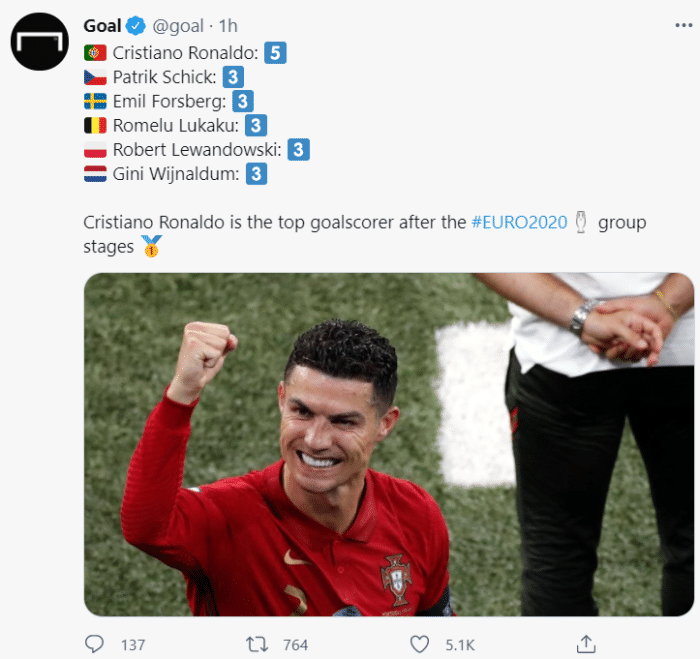 这是C罗本届欧洲杯的第4个和第5个进球,目前他以5球领跑欧洲杯射手榜,排第二的是希克、福斯贝里、卢卡库、莱万多夫斯基和维纳尔杜姆,他们都只打进了3球。