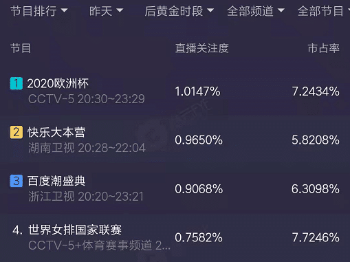 当然联想到欧洲杯的直播电视台普及范围更大,而且也是本届欧洲杯第一次在我们国内的黄金时间播出,所以说欧洲杯在晚上21-23点的比赛中依旧可以“破1”,这是一个相当傲人的成绩单。