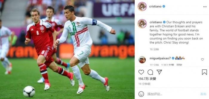 事件发生后,葡萄牙球星C罗也在Instagram上发文祝福这位国米球员,他写道:“我们为埃里克森祈祷,与他和他的家人同在。足球世界团结在一起等待好消息的到来,我希望你能早日重回赛场。”