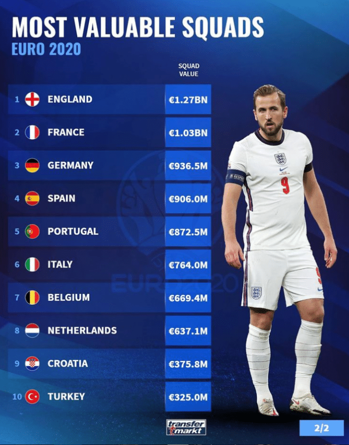 德转盘点欧洲杯各队身价:英格兰12.7亿欧第一