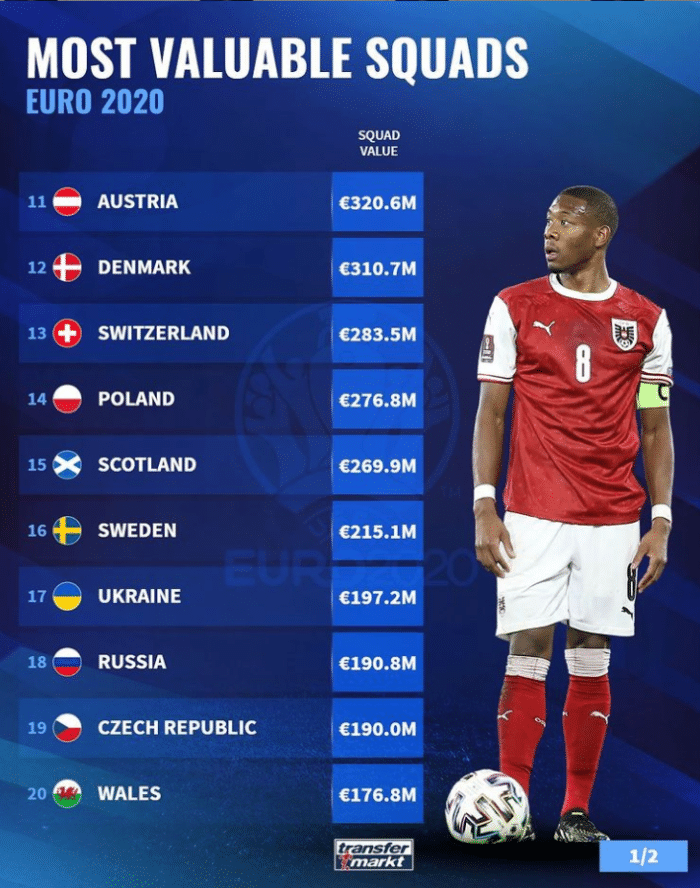 欧洲杯球队身价排行榜: