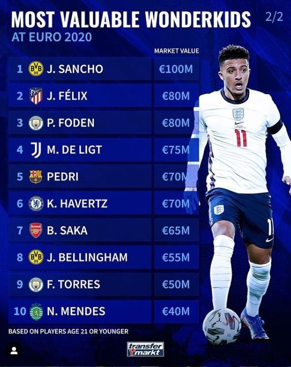 来源:24直播网06-06 14:4224直播网讯北京时间6月6如,欧洲杯即将开打,德转市场盘点了本届欧洲杯21岁及以下球员身价排行。桑乔1亿欧元领跑榜单,菲利克斯、福登分居第二第三,为切尔西打入欧冠进球的哈弗茨排名第六。