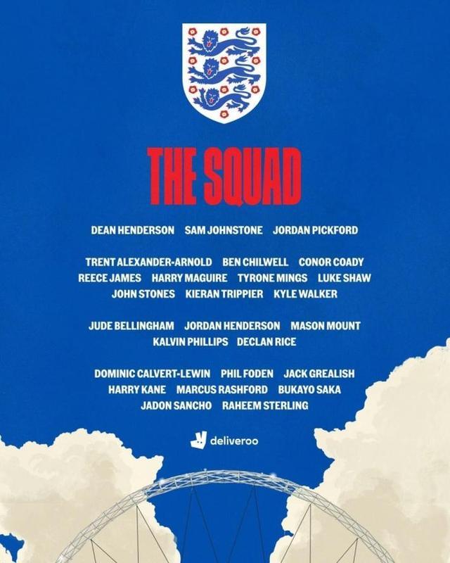 前锋:7-格拉利什(阿斯顿维拉)、9-凯恩(热刺)、10-斯特林(曼城)、11-拉什福德(曼联)、17-桑乔(多特)、18-勒温(埃弗顿)、20-福登(曼城)、25-萨卡(阿森纳)