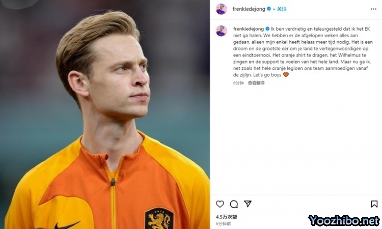 来源:24直播网06-11 12:1424直播网讯 北京时间6月11日,荷兰男足国家队官方宣布,27岁的巴萨中场弗兰基-德容因脚踝伤势无法及时恢复,将缺席今夏的欧洲杯。而随后,德容本人也在社媒予以确认。