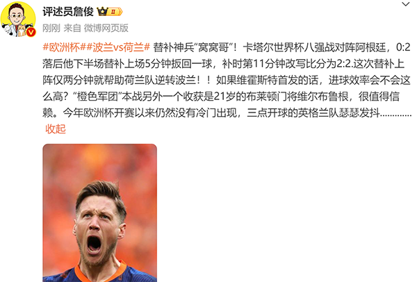之后荷兰队不断浪费机会,一直到科曼的神奇换人,韦霍斯特出战,第83分钟,替补上场的韦霍斯特破门得分,帮助荷兰队2比1领先波兰。之后双方均未取得进球,比分定格在2比1,荷兰队逆转波兰,迎来开门红。